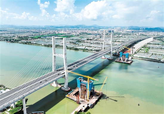 ??? 9月1日,中鐵建大橋局承建的深江鐵路關(guān)鍵性工程跨磨刀門水道主橋東主墩下橫梁澆筑完成。該橋橫跨中山和江門兩市交界的西江磨刀門水道,主橋為140米高墩大跨斜拉橋,采用智能造塔機(jī)施工。