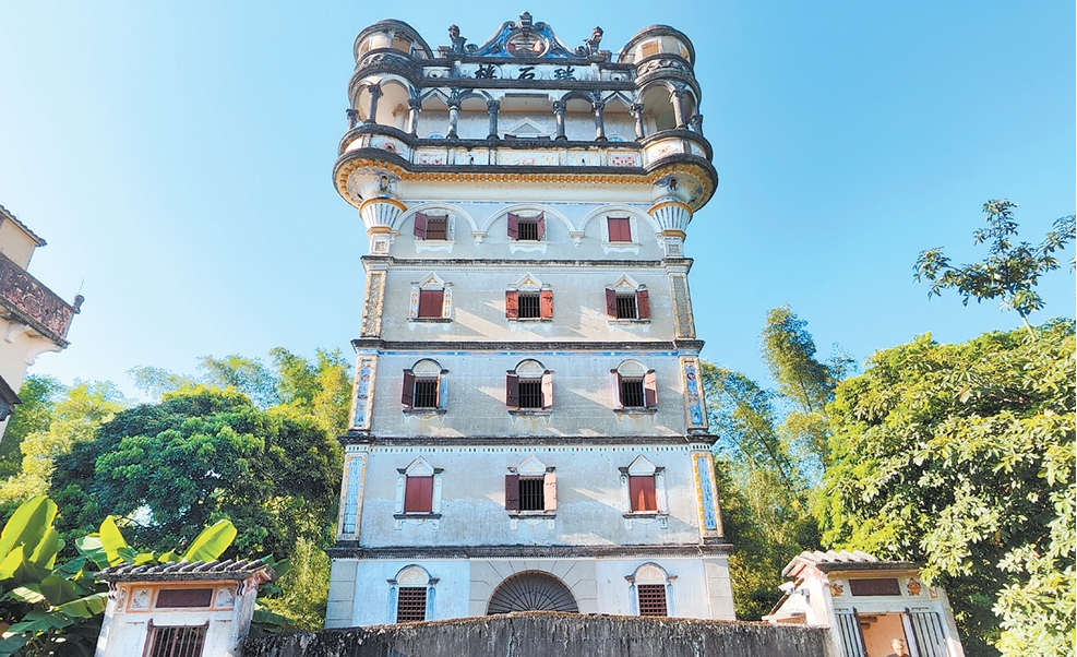 ????初抵開(kāi)平市蜆岡鎮(zhèn),一塊顯眼的廣告牌映入眼簾,其上赫然寫(xiě)著——“碉樓之王在蜆岡”。懷揣著幾分好奇,記者乘車(chē)前往蜆岡鎮(zhèn)錦江里碉樓群。剛踏入這片地界,抬頭即可望見(jiàn)矗立于鄉(xiāng)野之中的瑞石樓。這座完美融合了中西建筑風(fēng)格的碉樓,不僅是開(kāi)平現(xiàn)存最高、最美的碉樓,更被譽(yù)為“開(kāi)平碉樓第一樓”。