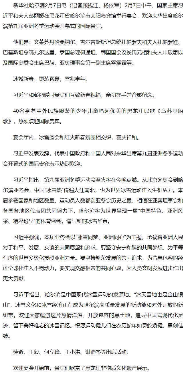 習(xí)近平和彭麗媛為出席哈爾濱第九屆亞洲冬季運(yùn)動(dòng)會(huì)開幕式的國(guó)際貴賓舉行歡迎宴會(huì)