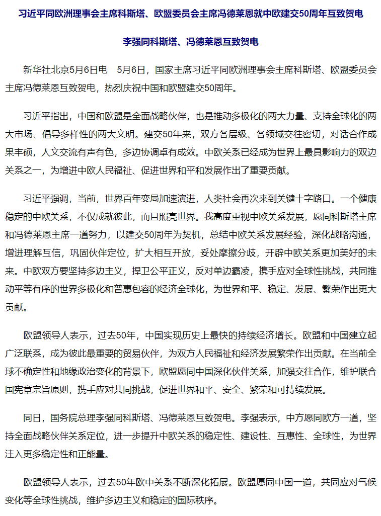 習(xí)近平同歐洲理事會主席科斯塔、歐盟委員會主席馮德萊恩就中歐建交50周年互致賀電