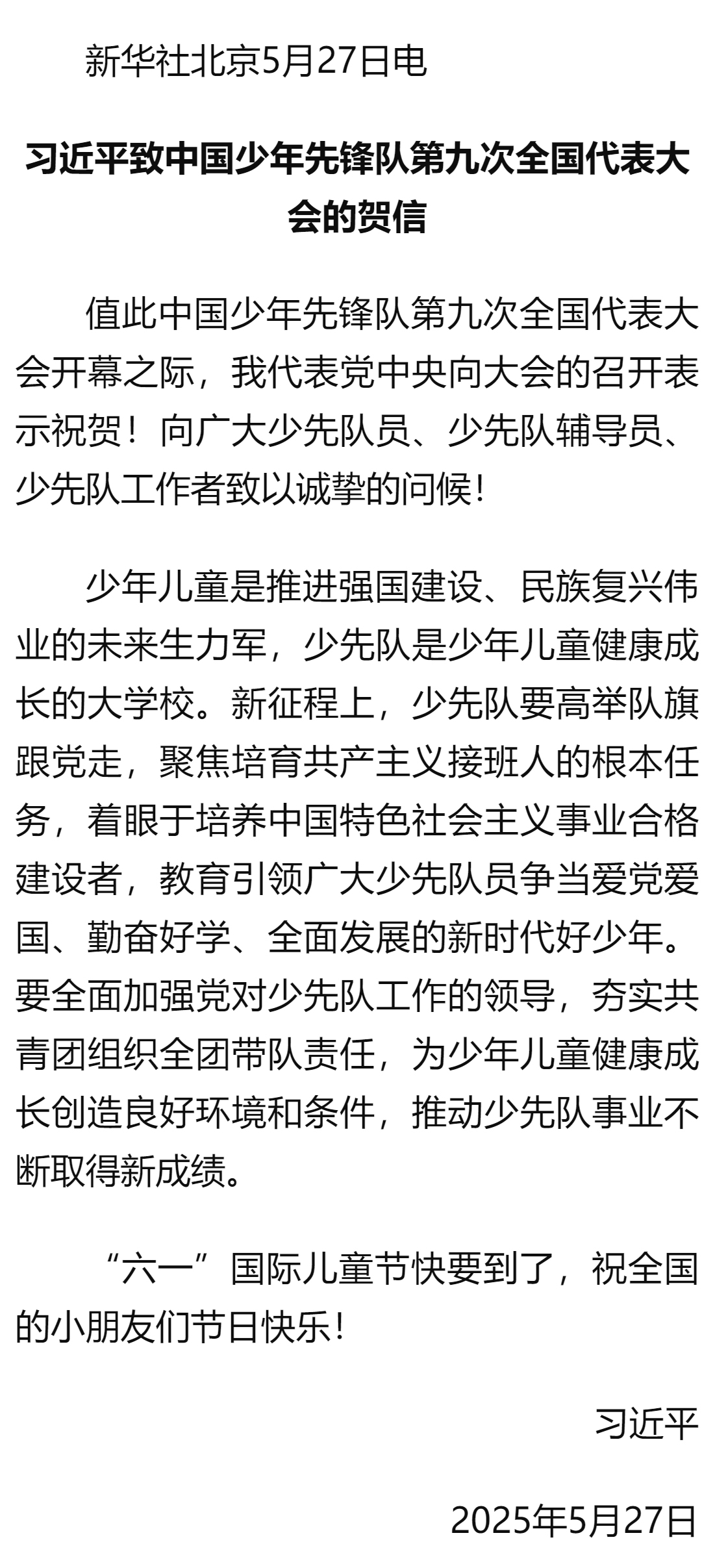習(xí)近平致中國少年先鋒隊(duì)第九次全國代表大會的賀信