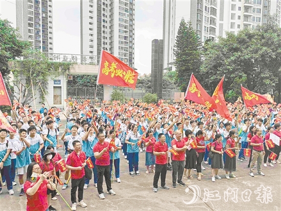 ????今天,我市近2.9萬名學(xué)子將走進(jìn)考場(chǎng),書寫青春的答卷。圖為新會(huì)梁?jiǎn)⒊o(jì)念中學(xué)舉辦送考儀式,為考生們加油鼓勁。鐘珍玲攝