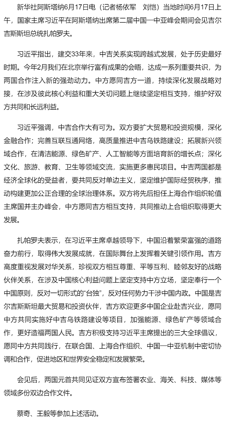 習(xí)近平會(huì)見(jiàn)吉爾吉斯斯坦總統(tǒng)扎帕羅夫