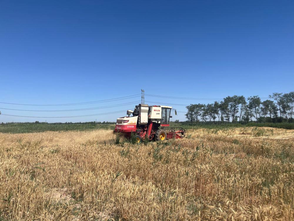 ??△收割機在山東武城縣郝王莊鎮(zhèn)的耐鹽堿小麥試驗示范基地里作業(yè)。