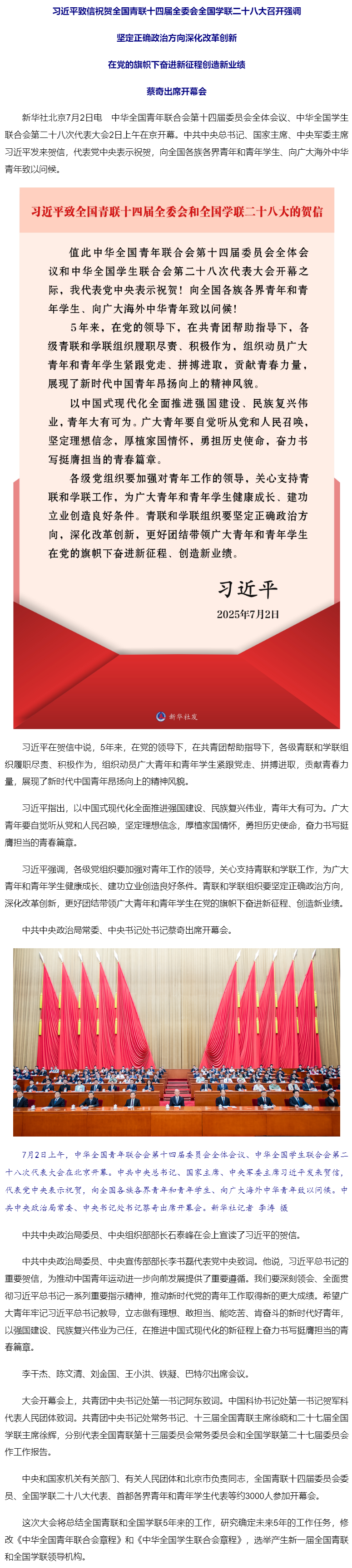 習近平致信祝賀全國青聯(lián)十四屆全委會全國學聯(lián)二十八大召開