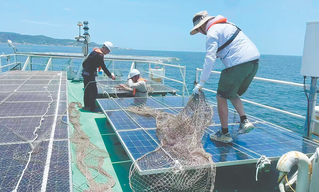 位于臺山川島海域的海洋牧場重要現(xiàn)代裝備“臺山1號”已進入半潛狀態(tài),平臺外部設施均已加固完成。臺山海洋集團供圖