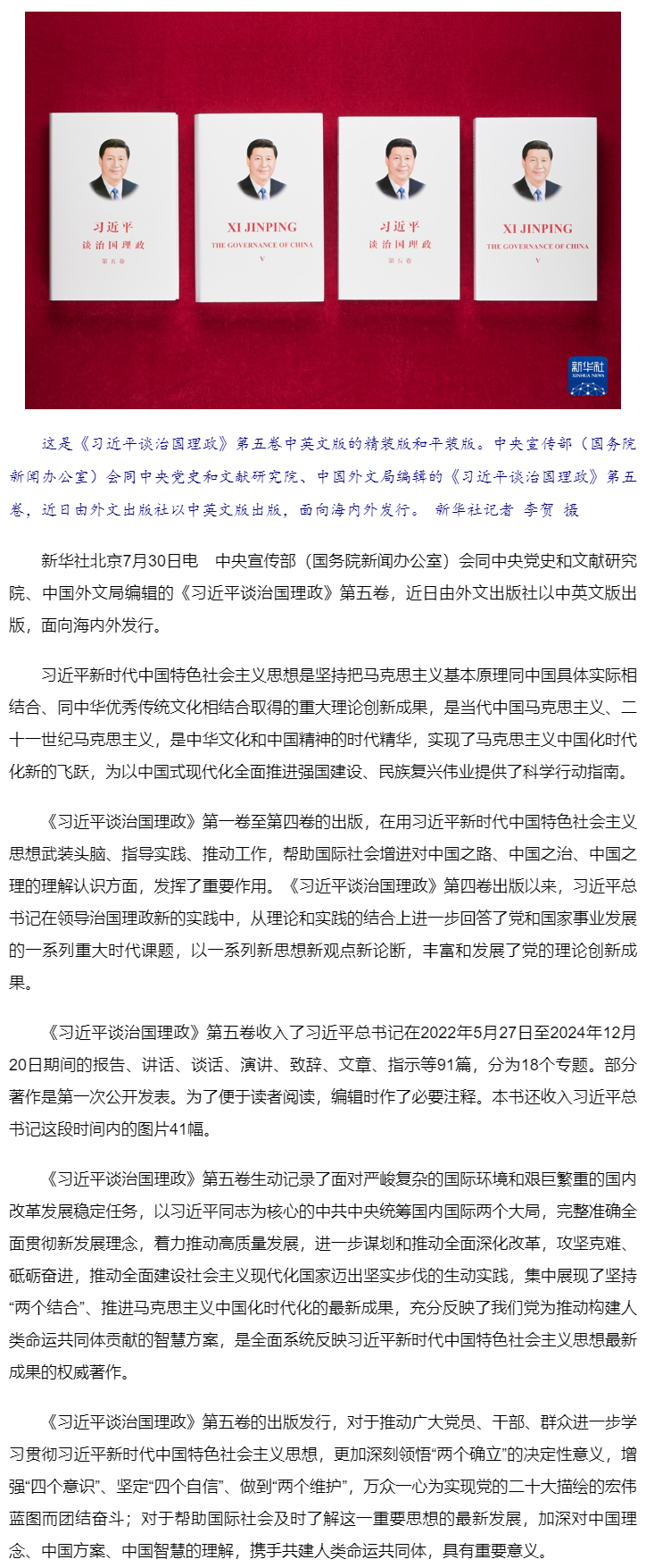 《習(xí)近平談治國理政》第五卷中英文版出版發(fā)行