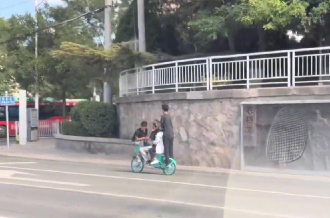 ??2025年7月,甘肅蘭州市4名未成年人正在同乘一輛共享電動車。(蘭州市公安局交警支隊供圖)