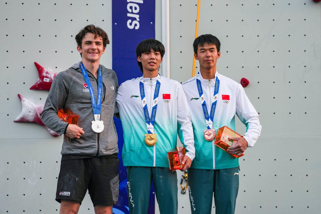 8月14日,冠軍中國選手儲守宏(中)、亞軍美國選手沃森(左)和季軍中國選手龍見國在攀巖男子速度個人賽頒獎儀式上合影。新華社記者 丁增尼達(dá) 攝