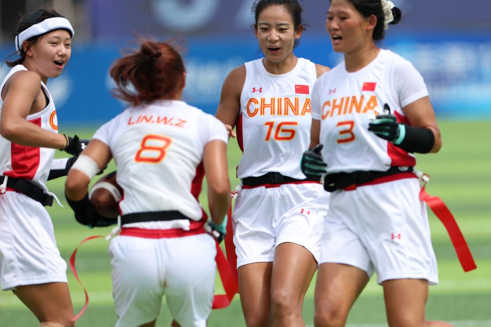 8月14日,中國隊球員慶祝得分。當(dāng)日,2025年成都世運會腰旗橄欖球女子預(yù)賽A組比賽中,中國隊45:47不敵奧地利隊。新華社記者 陳斌 攝