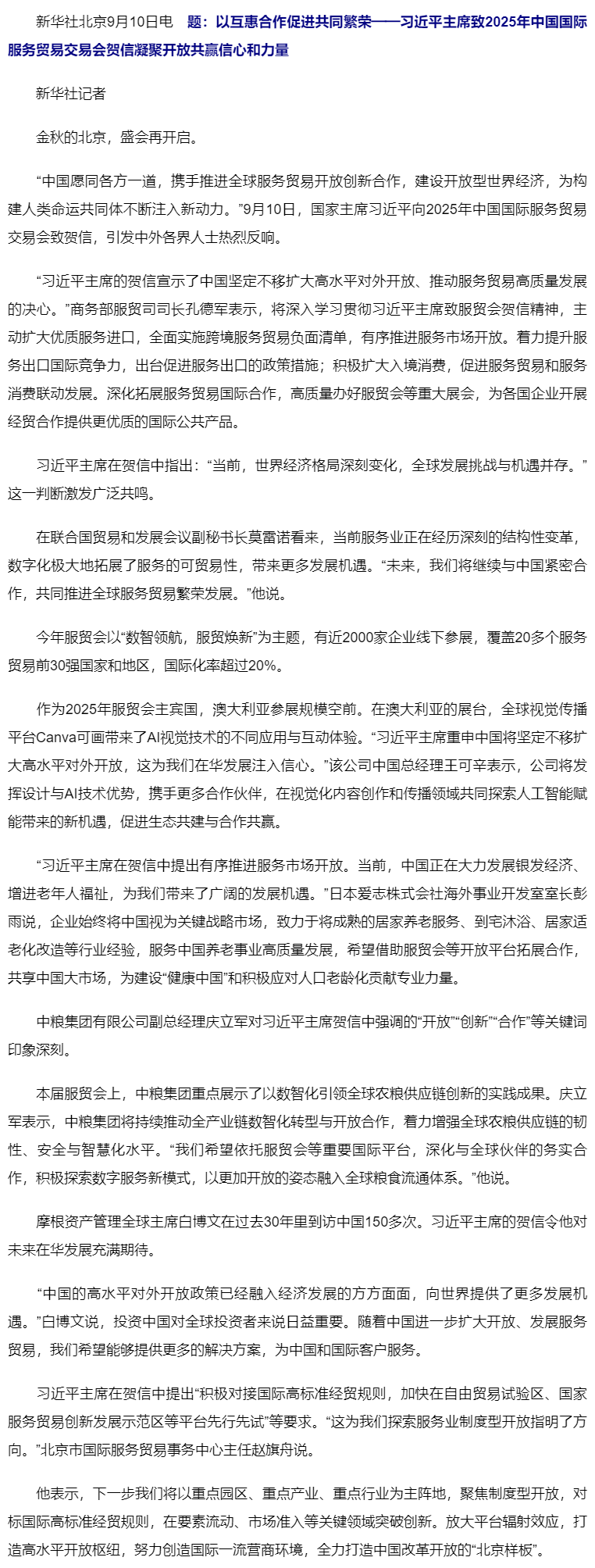 以互惠合作促進(jìn)共同繁榮——習(xí)近平主席致2025年中國國際服務(wù)貿(mào)易交易會賀信凝聚開放共贏信心和力量
