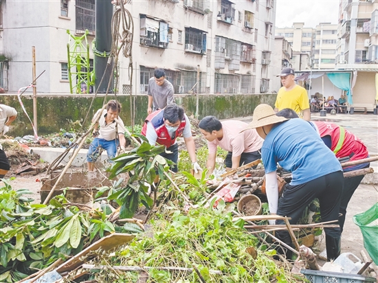 臺風過后,新會區(qū)圭峰會城組織超6000人次投入愛國衛(wèi)生行動。25日下午,記者跟隨工作人員來到位于世紀商業(yè)街的一處居民樓,在二樓露天平臺,天下著小雨,社區(qū)黨委發(fā)動黨員、網格員、志愿者組成攻堅隊,調用吊車、清運車等設備,冒雨清理枯枝雜物、積水容器。