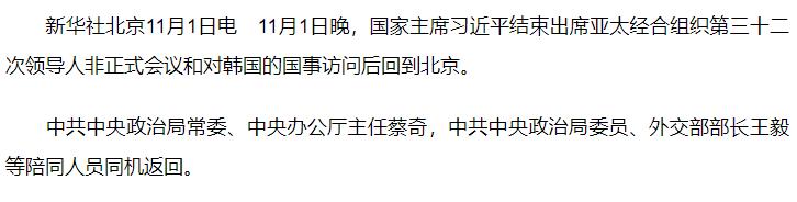 習(xí)近平結(jié)束出席亞太經(jīng)合組織第三十二次領(lǐng)導(dǎo)人非正式會(huì)議和對(duì)韓國(guó)的國(guó)事訪問回到北京