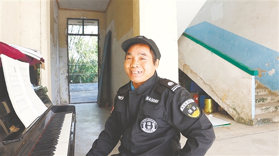 “彈琴是我個人的興趣愛好,沒有老師教,是自學的?!标懩攫B(yǎng)是廣西人,在良山小學擔任保安剛滿一年。他個子不高,皮膚黝黑,穿著一身黑色的保安制服。然而,這位外表樸實的漢子,內心卻蘊藏著對音樂的細膩感知。
